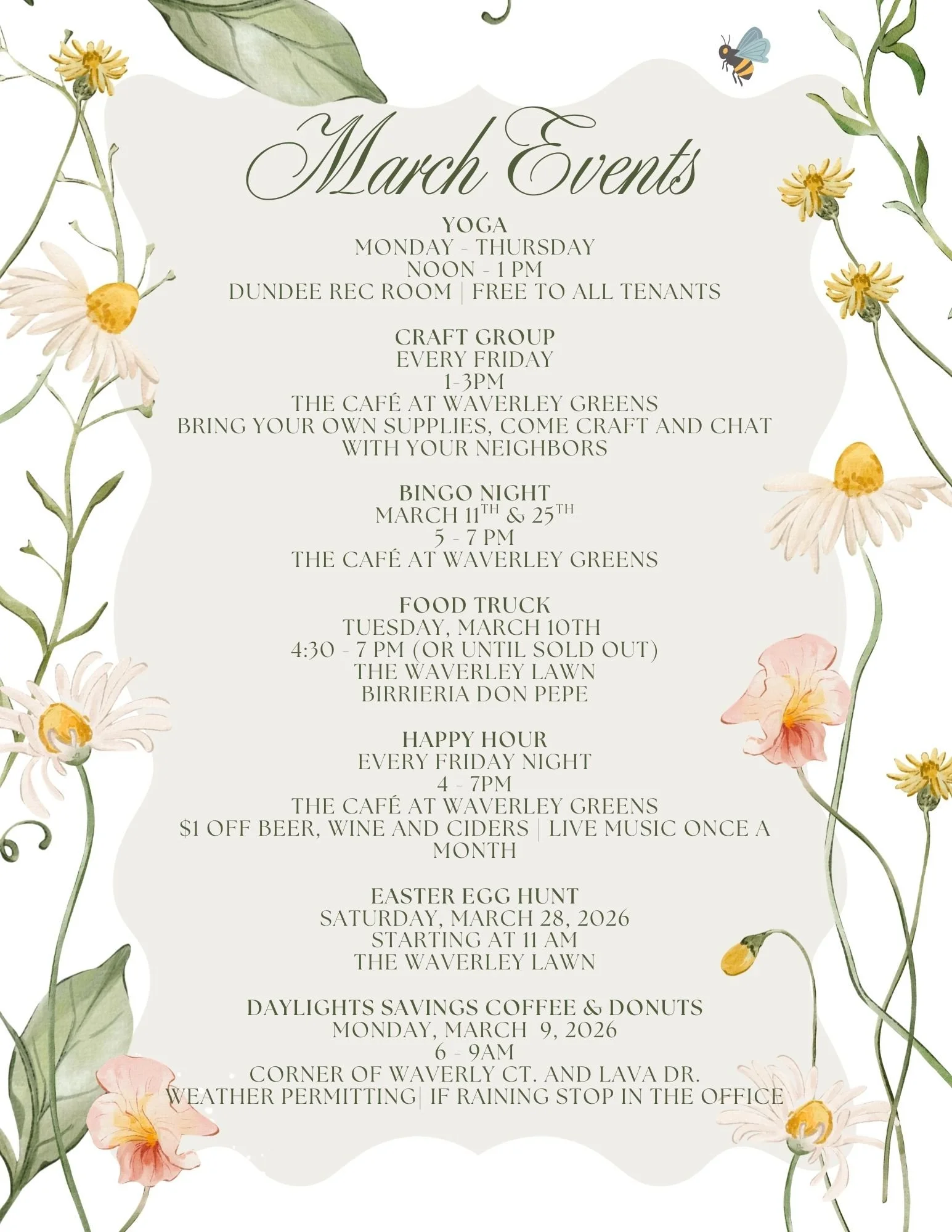 At Waverley Greens, we believe apartment living should feel like community living. Here’s what’s happening this March.